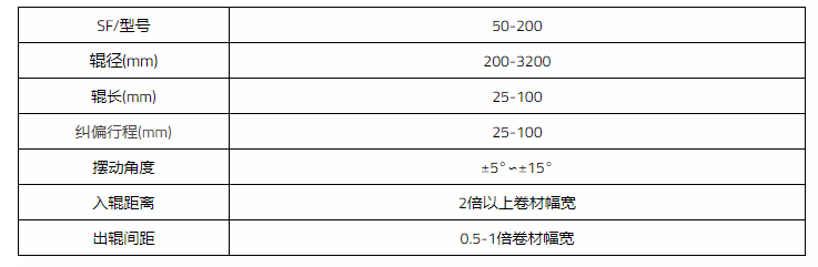 SF纠偏机构是无支点过程纠偏,当物料进料路径发生偏移时,转动托架围绕一个虚拟支点移动,将物料调整到设定位置。SF纠偏机构适于方便配置于具有较长入辊行程的设备,适用不易变形及偏差不大的材料。分为单辊、双辊,其他要求也可按需定制。